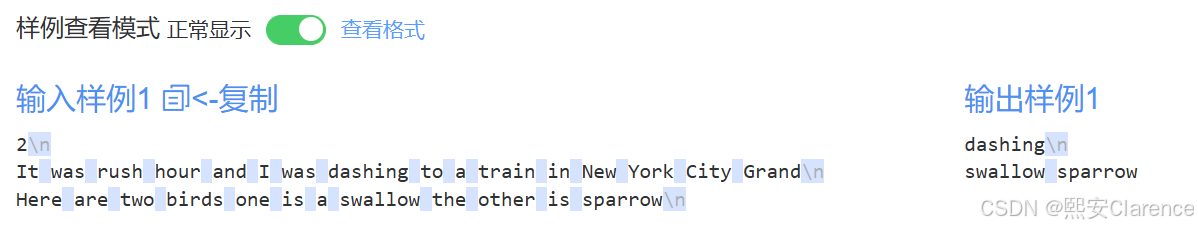 t行,每行一个字符串(不含标点符号,至少包含1个单词。单词以空格分割,无需判定单词的合法性)