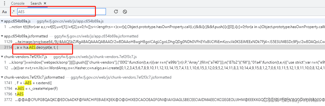 我们先取一个讨巧的做法,既然我们怀疑它是AES加密,那么我们就搜索AES,或者搜索初始向量iv、填充方式(pkcs7、pkcs5等)、加密方式(CBC、EBC等),这里我们先搜索AES关键词: