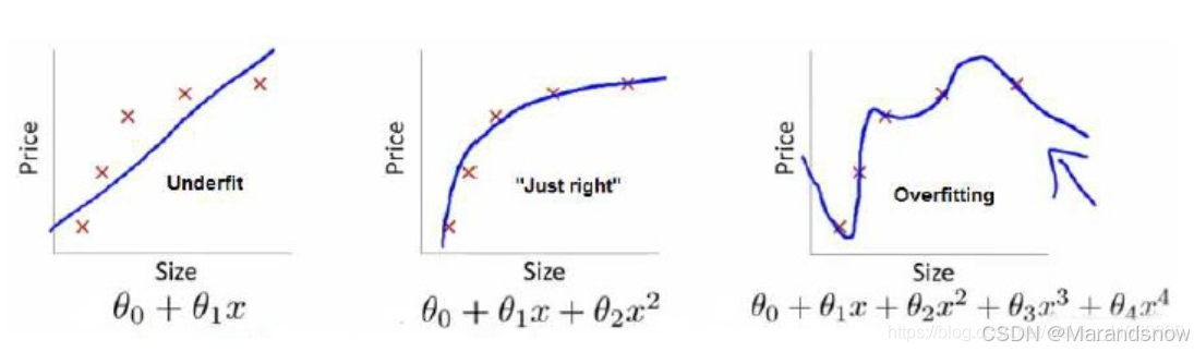 最右边的图中,拟合程度非常高,甚至每一个点都能通过表达,这个难道就是我们所渴望得到的 吗?并不是!我们的数据集中无法避免的存在着许多噪声,而在理想情况下,我们希望噪声对我们的模型训练的影响为0。而如果模型将训练集中每一个点都精准描述出来,显然包含了许许多多噪声点,在后续的测试集中得到的准确率也不高。另一方面,太过复杂的 直接导致函数形状并不平滑,而会像图中那样拐来拐去,并不能起到预测的作用,“回归”模型也丧失了其预测能力(也就是模型泛化能力),也就是过拟合,泛化能力差,训练样本集准确率高,测试样本集准确率低。