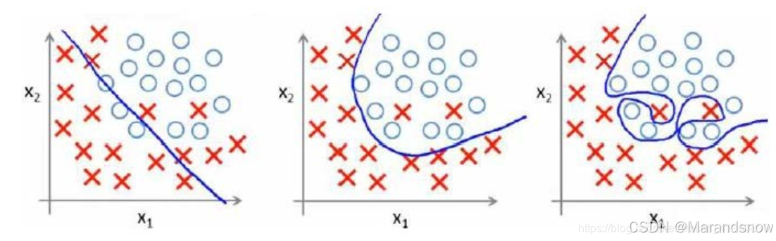 最左边的图,为欠拟合,泛化能力差,训练样本集准确率低,测试样本集准确率低。