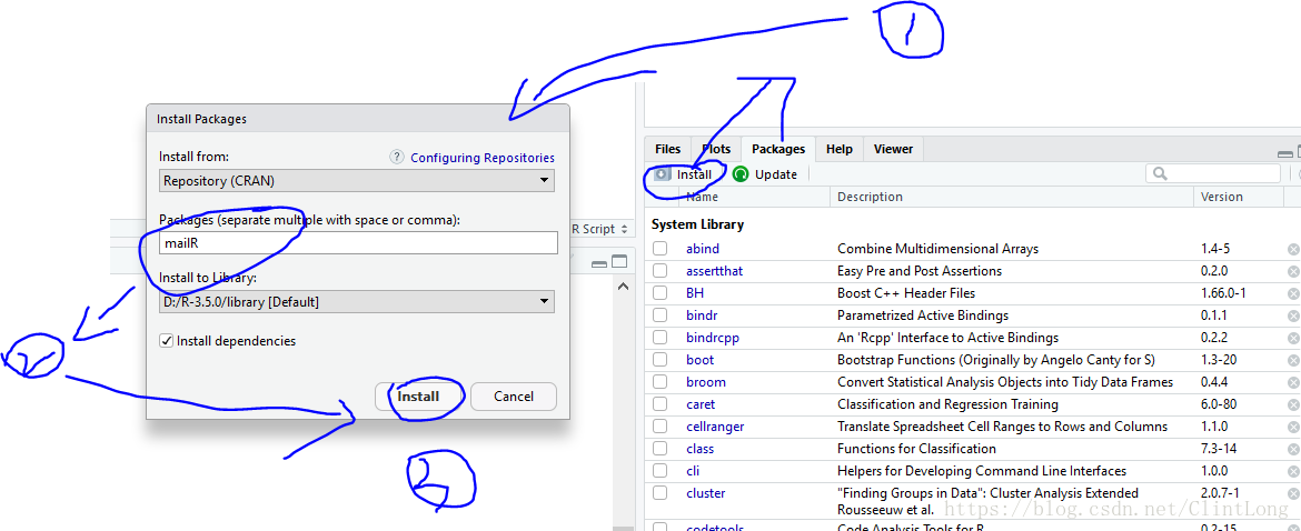 a.使用code,如上例,我们可以使用 install.packages(“mailR”)(需要有网络),安装完后我们就可以在package栏里面搜索到mailR了。