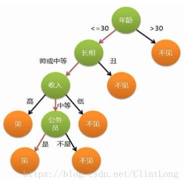 简而言之,决策树是一个分类器(classifier)。 它利用树状结构,来对于特征以及潜在的结果之间的关系建立模型。如下图(来源网络):