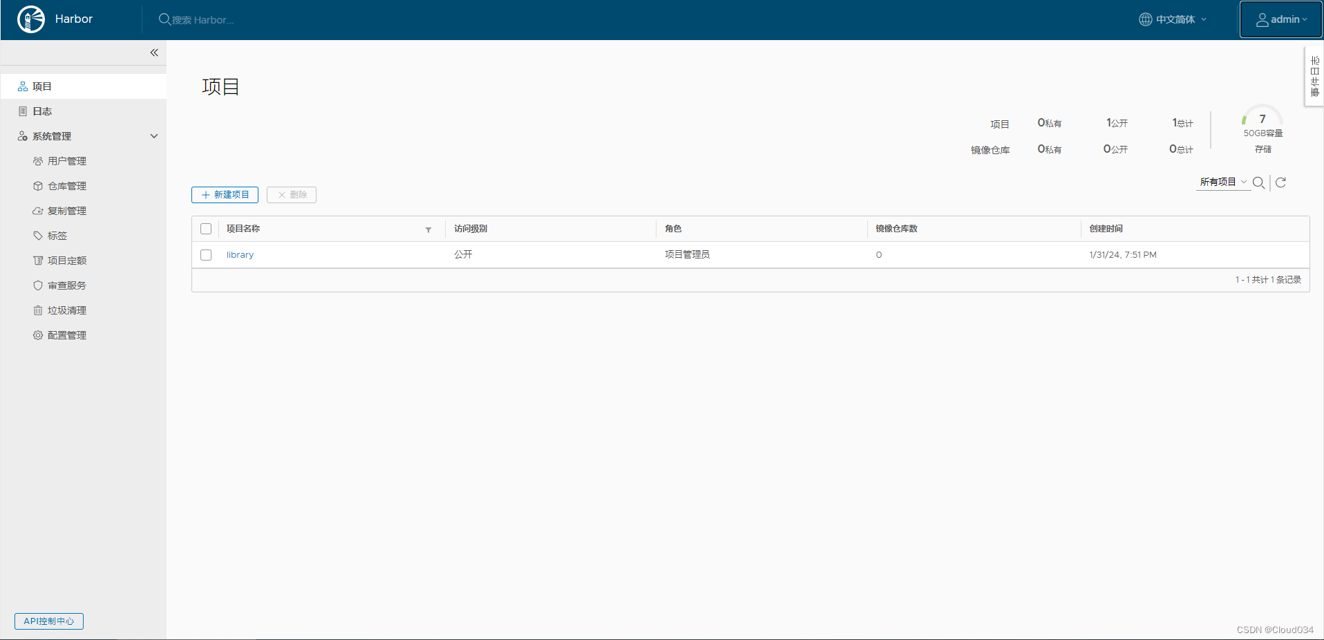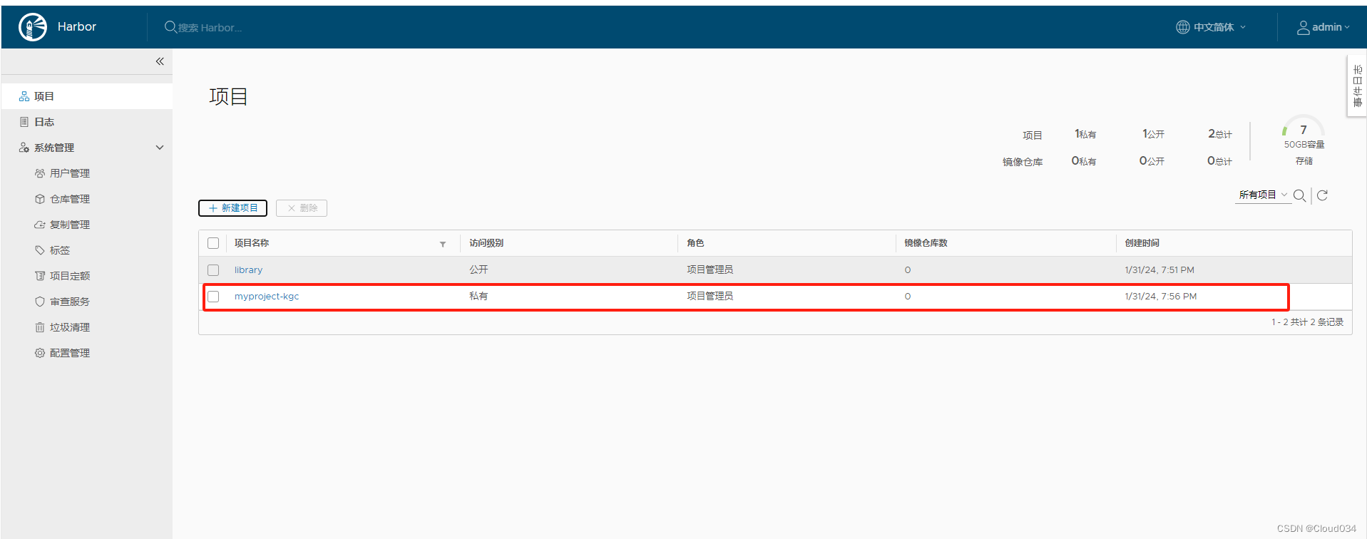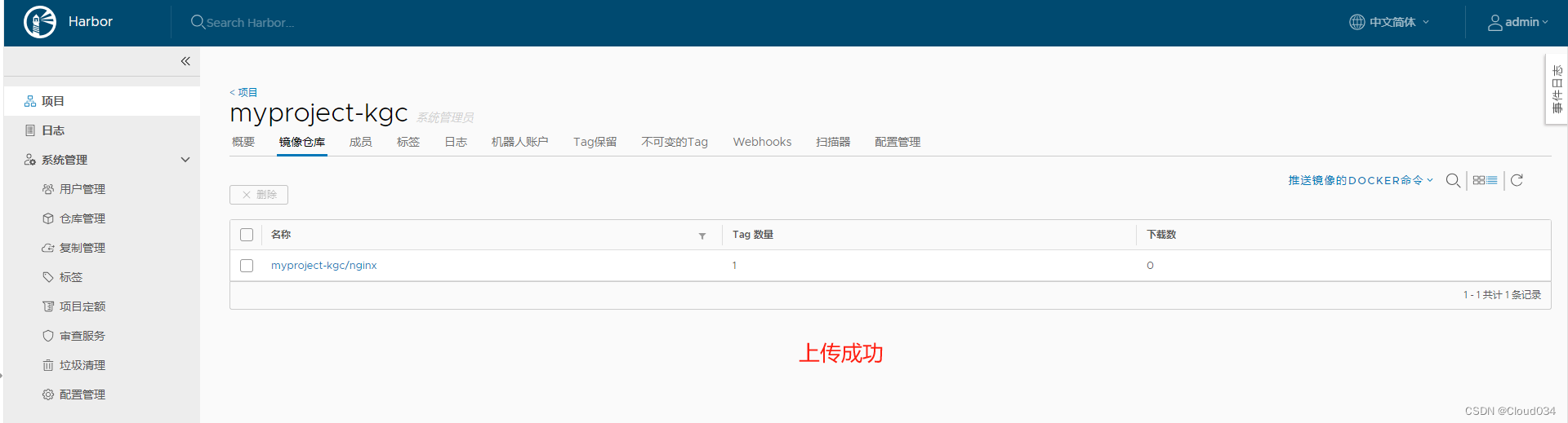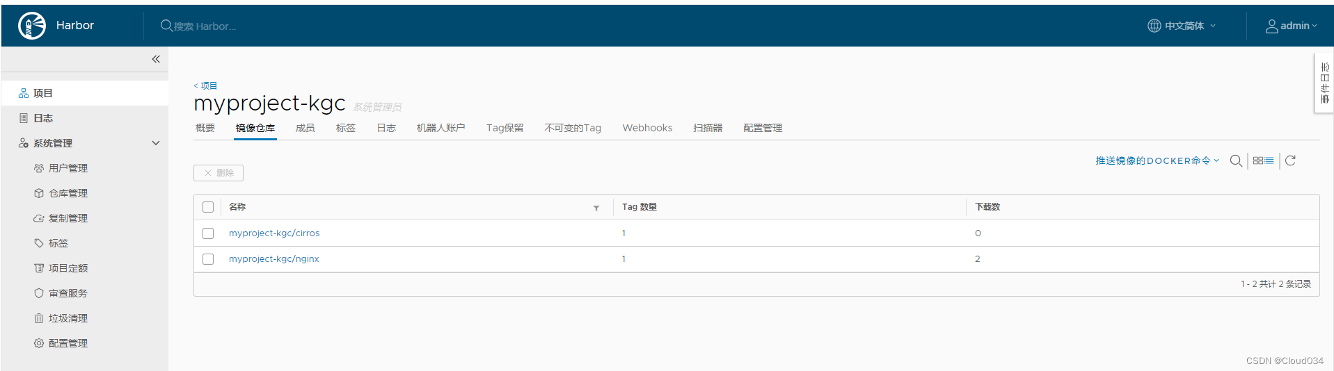 刷新 Harbor 的 Web 管理界面进行查看,会发现 myproject-kgc 项目里面有两个镜像