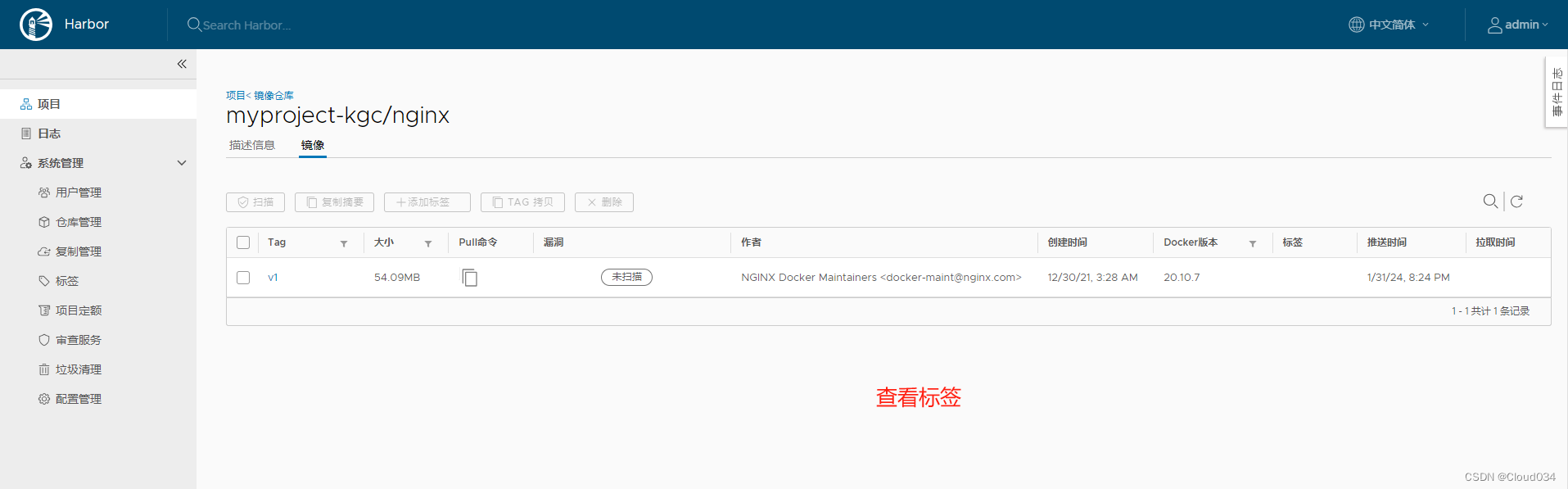 在 Harbor 界面 myproject-kgc 目录下可看见此镜像及相关信息