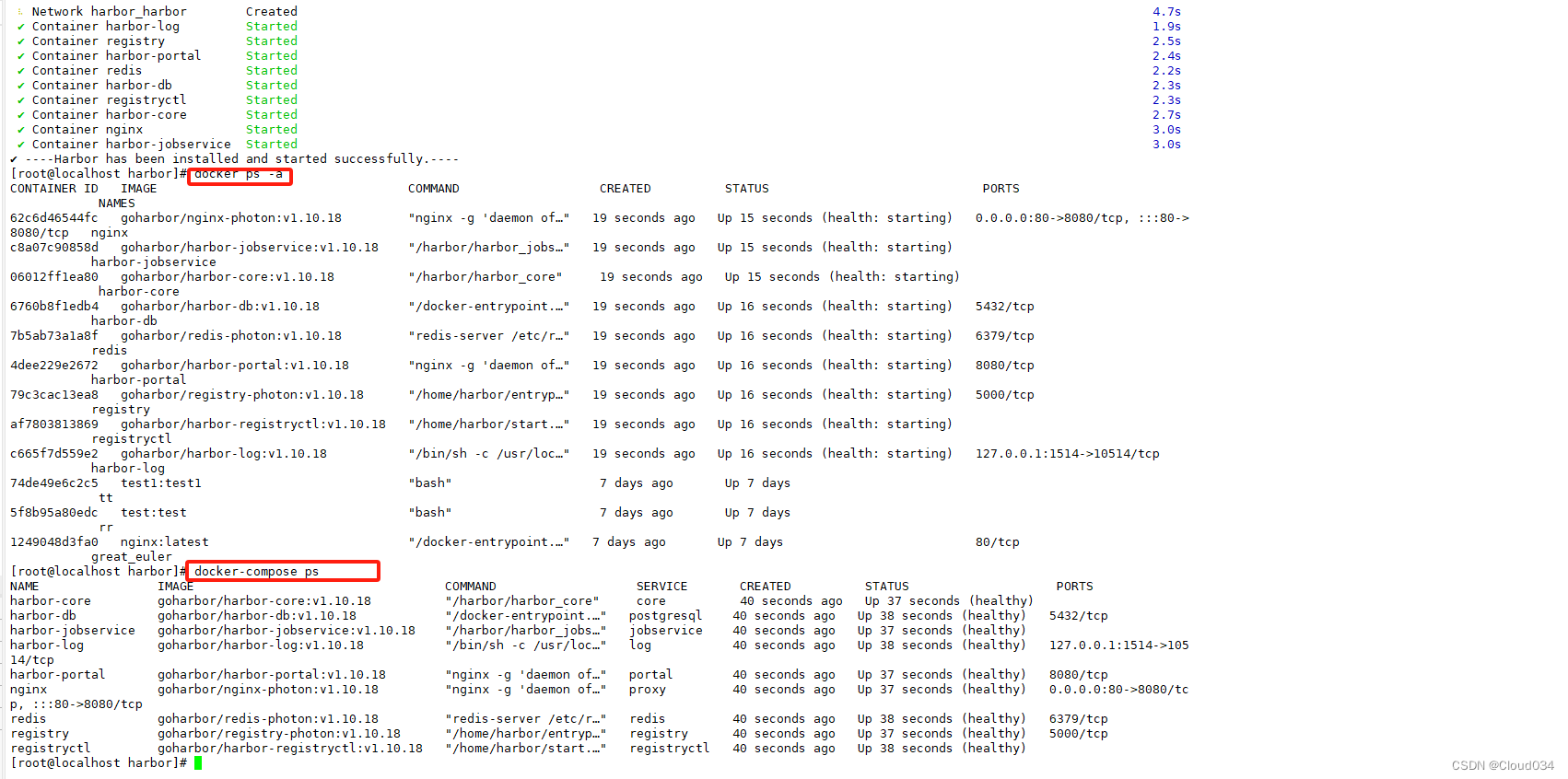 进入harbor安装目录,先用./prepare 准备编排文件,然后用./install.sh启动,最后使用docker-compose ps进行查看