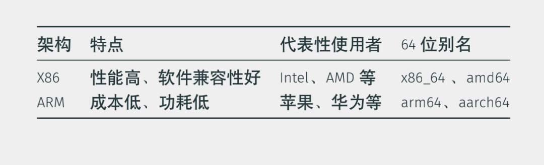 国内的华为会生产基于ARM架构的服务器,64位ARM架构CPU也有别名,例如arm64、aarch64,这两种叫法表达同一个意思。