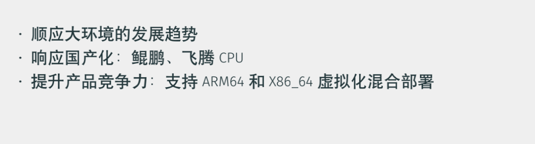 另外是适配了ARM架构能够提升产品的竞争力,竞争力体现在能够支持管理基于ARM64位和X86_64架构的虚拟化混合部署。