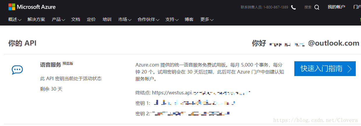 注册完成后,在https://azure.microsoft.com/zh-cn/try/cognitive-services/?api=speech-services,添加“语音服务”功能后,会自动收到如下图的终结点和密钥。