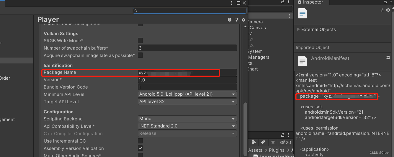 3.Unity player settings内的package name与AndroidManifest.xml保持一致,至于company name与product name可不与其一致(不影响)