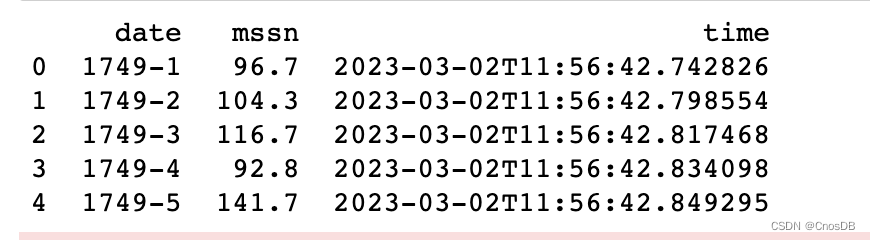 ### df 为pandas的dataframe,"sunspot"为CnosDB中的表名,['date', 'mssn']为需要写入的列的名字