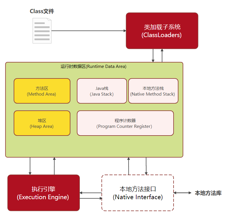 - 运行时数据区(堆、栈、方法区等) → 存放执行所需的数据。