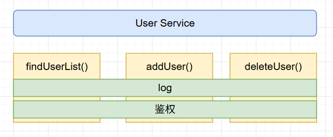 AOP 是设计思想,Spring AOP 、AspectJ 才是技术实现, AOP 思想本质的作用解耦。我们将记录日志、鉴权功能解耦为切面,进而引出 AOP 理念:将分散在各个业务逻辑代码中相同的代码,通过横向切割的方式抽取到一个独立的模块中。用图表示: