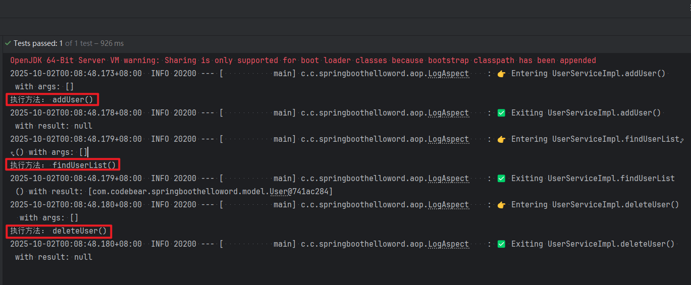 再次执行,可以看到每个方法前后都有日志,解决了最初的痛点,避免大量手动修改代码。