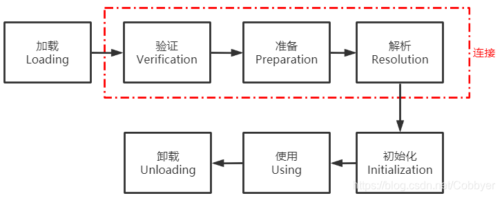 类从被加载到虚拟机内存中开始,到卸载出内存为止,它的整个生命周期包括:加载 (Loading)、验证(Verification)、准备(Preparation)、解析(Resolution)、初始化 (Initialization)、使用(Using)和卸载(Unloading)7个阶段。其中验证、准备、解析3个部分统称为连接(Linking)。