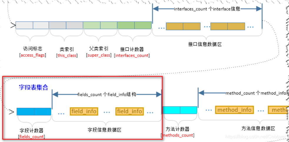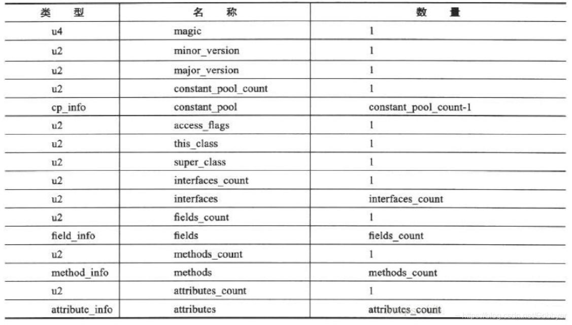 类索引用于确定这个类的全限定名,父类索引用于确定这个类的父类的全限定名.接口索引集合用来描述这个类实现了哪些接口,这些被实现的接口按implements语句后的接口顺序从左到右排列在接口索引集合中。