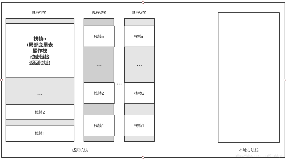 栈帧(Stack Frame) 是用于支持虚拟机方法调用和方法执行的数据结构,它是虚拟机运行时数据区中虚拟机栈(Virtual Machine Stack)的栈元素。栈帧存储了方法的局部变量表、操作数栈、动态连接和方法返回地址等信息。每一个方法从调用开始至执行完成的过程,都对应着一个栈帧在虚拟机栈里面从入栈到出栈的过程。