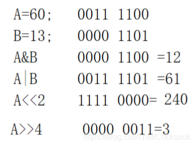 | | | 如果存在于任一操作数中,二进制 OR 运算符复制一位到结果中。 | (A&B)得到的结果是61 |