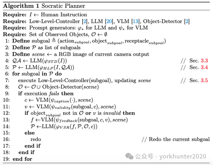 为此,引入 Socratic Planner,这是第一个无需任何训练数据即可进行推断的零样本规划方法。Socratic Planner 首先通过自我提问和回答将指令分解为任务的子结构信息,然后将其转化为高级规划,即一系列子目标。子目标按顺序执行,基于视觉的重规划机制通过密集的视觉反馈动态调整规划。
