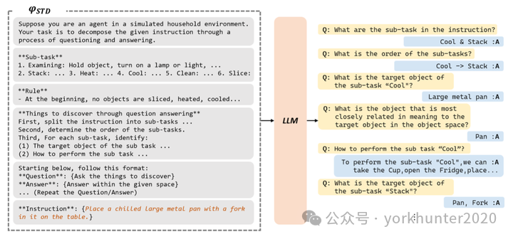 任务中子结构信息的深度和内容因其复杂性而异。为了帮助大语言模型 (LLM) 准确推理一般体现指令遵循 (EIF) 任务的这些信息,以“要发现的事”的形式为它们提供指导。这些指令促使 LLM 考虑一些基本方面,例如识别组成子任务、它们的排序、目标对象和任务执行的具体方法。如图所示,STD 的提示包括前面提到的“要发现的事”,以及 LLM 的使命、简明的子任务解释和 3D 模拟器规则。LLM 最终生成输出即问答序列 (QA),根据提示发现子结构信息。