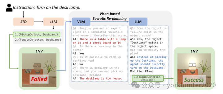STD 中的 LLM 通过自我提问和回答来分解任务。使用问答对,任务规划器通过 LLM 合成一系列子目标,其中每个子目标要么是动作-目标对(例如,(拿起,平底锅)),要么是包含动作、目标和容器的三元组(例如,(放,平底锅,冰箱))。将Socratic Planner 与分层语言条件空间模型 (HLSM) [2] 的低级控制器集成在一起,该控制器在环境中执行这些子目标。如果智体在按顺序执行子目标时遇到失败,基于更详细的视觉信息(例如,场景的视觉描述、子目标可行性和当前场景中的失败原因),VSR 中的视觉-语言模型 (VLM) [13] 向任务规划器提供密集的视觉反馈,无需直接依赖人工或模拟数据。这最大限度地提高了 LLM 的推理能力,从而有效地调整规划。
