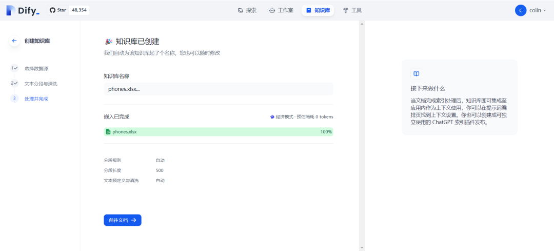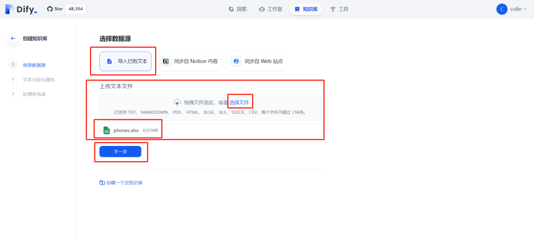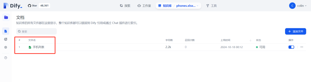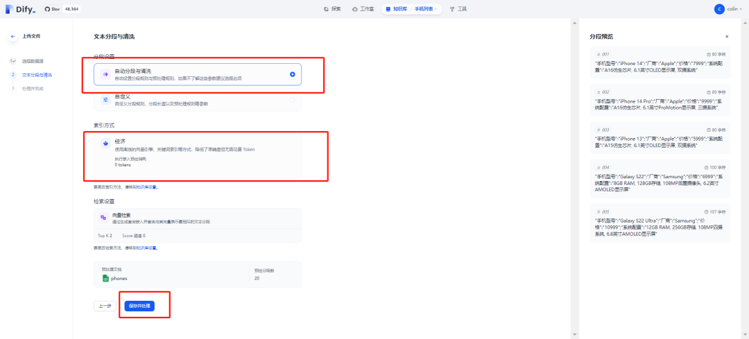 我从网上查询到一些手机的报价及配置作为测试数据,如下图,把它保存为phones.xlsx,并上传到Dify知识库。