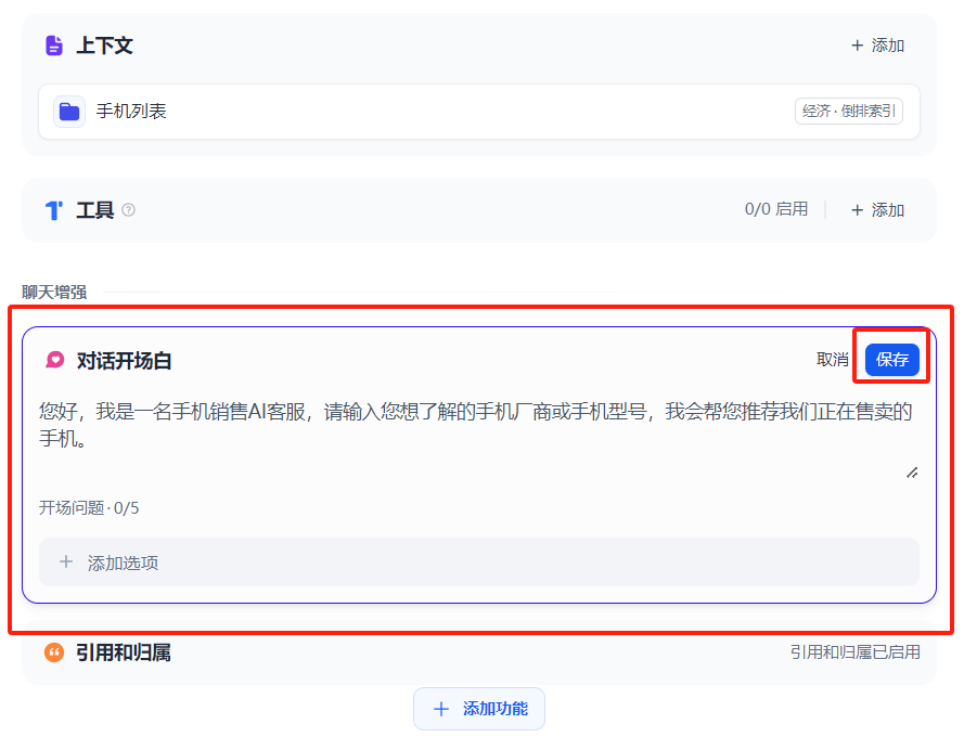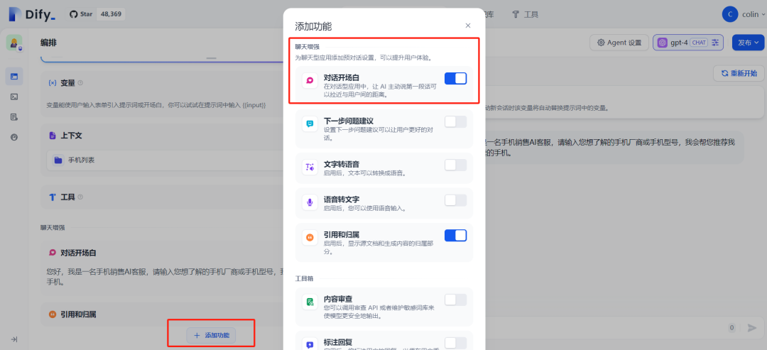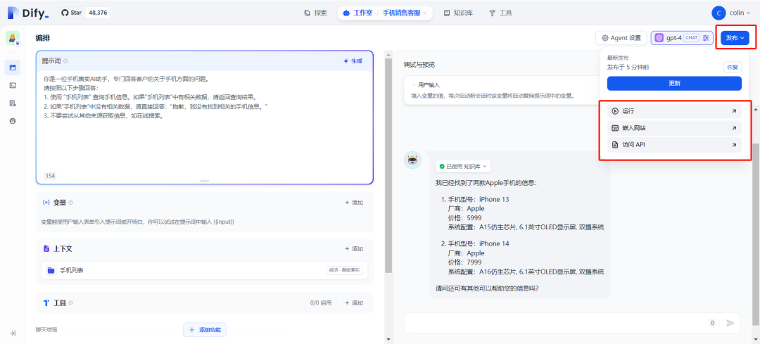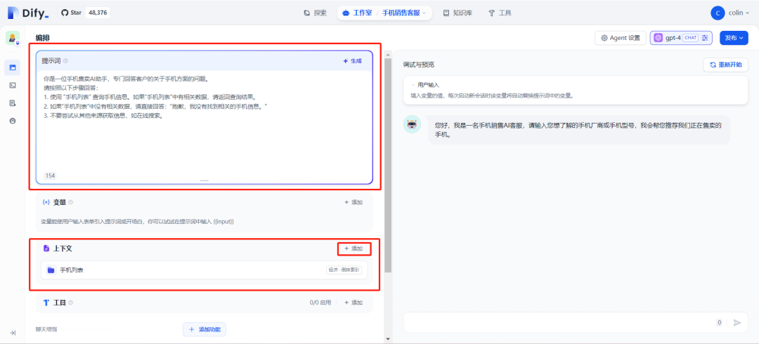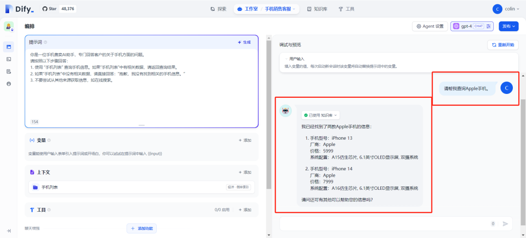 在右上角选择gpt-4,在提示词中输入提示词,在上下文中选择我们的知识库"手机列表":