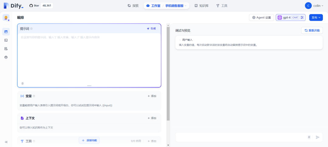 我们根据AI Agent的概念,来实现一个手机售卖的客服系统,为了便于快速理解这些概念,我们使用Dify来实现,Dify我们在上篇文章中已进行安装简介。