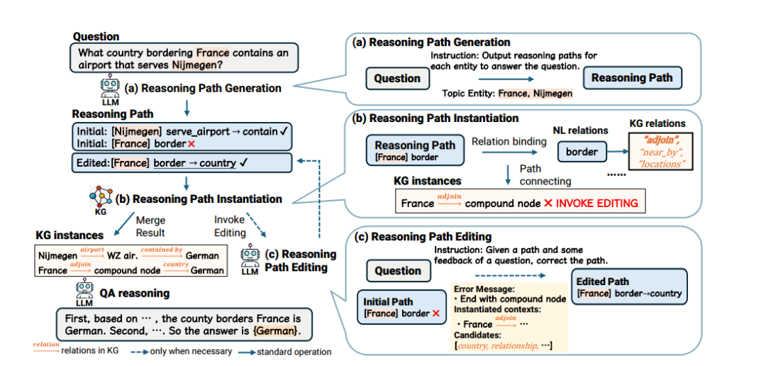 示例: 例如,对于问题“哪个国家与法国接壤并包含服务尼美根的机场?”,推理路径生成:
