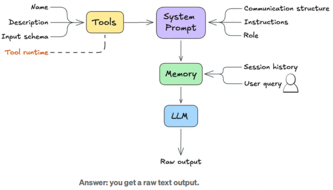 到目前为止我们所涵盖的五个步骤为设置智能体奠定了基础。但是,如果在这个阶段我们通过大语言模型运行用户查询会发生什么呢?