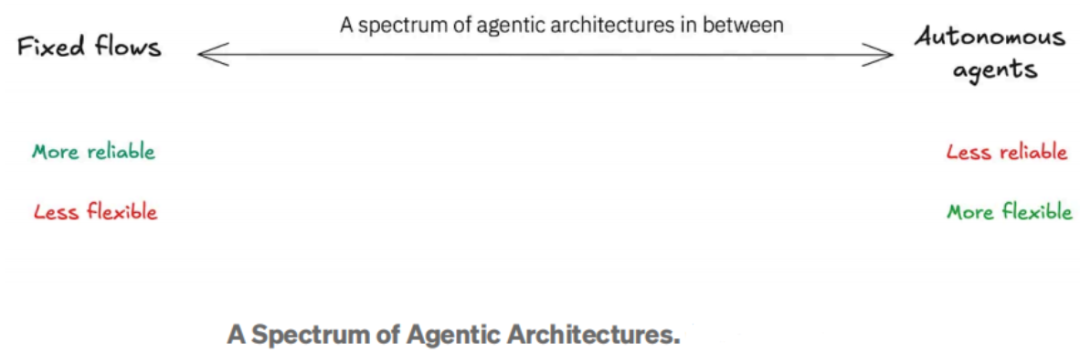 智能体架构存在于一个范围内,从固定工作流程的可靠性到自主智能体的灵活性。例如,像检索增强生成(RAG)这样的固定流程可以通过自我反思循环进行增强,使程序在初始响应不足时能够进行迭代。或者,一个反应式(ReAct)智能体可以配备固定流程作为工具,提供一种灵活而结构化的方法。架构的选择最终取决于用例以及在可靠性和灵活性之间的期望权衡。