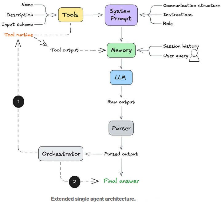 如果触发了工具调用,工具的输出将被发送回大语言模型(作为其工作记忆的一部分)。然后,大语言模型将决定如何处理这个新信息:要么执行另一个工具调用,要么向用户返回答案。
