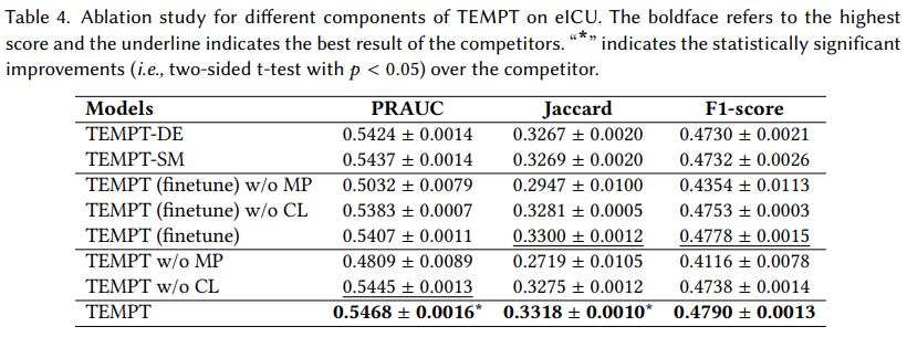 TEMPT-DE表示我们使用不同参数的medical encoder编码诊断和治疗。TEMPT-SM表示在预训练阶段对两个预训练任务使用相同的MLP。这两个变体效果均有下降,说明了我们设计的合理性。w/o MP和w/o CL表示分别去掉两个预训练任务,结果说明了每个预训练任务对于学习通用医疗知识都是有贡献的。