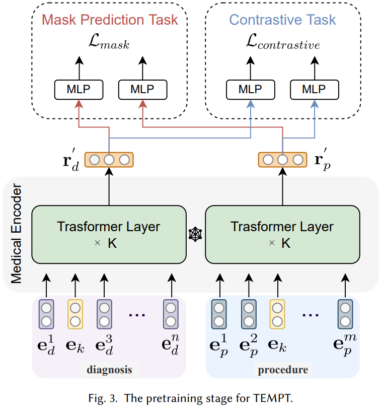 在预训练阶段,我们使用全部医院的数据来使模型学习一般性的医疗知识。但是,由于数据稀疏问题,这种学习通常是困难的。并且,诊断和治疗之间的关系之前很少被考虑到。因此,本文设计了两个自监督任务来进行预训练,分别是是Mask Prediction和Contrastive任务,如图3所示。