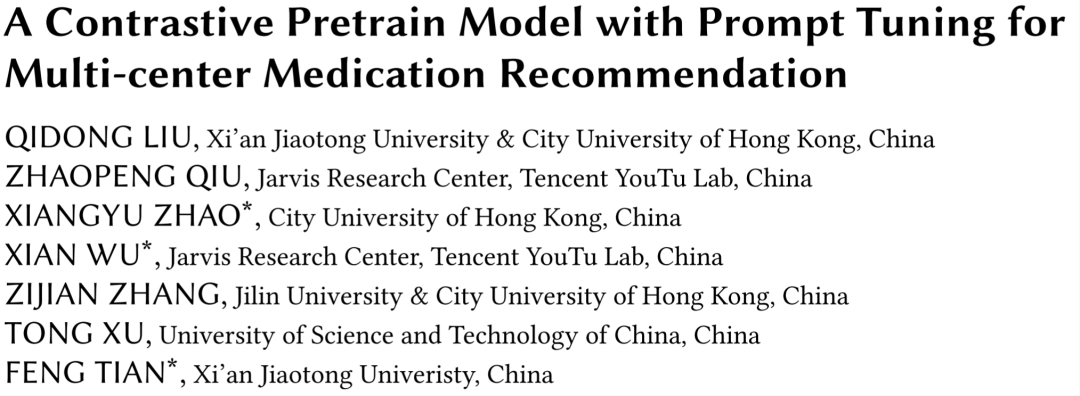 今天跟大家分享一篇来自西安交通大学、香港城市大学、腾讯优图实验室天衍研究中心、吉林大学和中国科学技术大学的论文,该论文已被TOIS接收。这篇文章提出了一种新颖的提示微调的多中心药品推荐模型,名为TEMPT。该方法首次研究了药品推荐中的多中心问题。