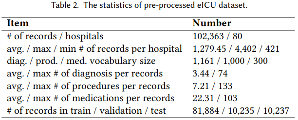 我们在eICU数据集上进行了广泛的实验,因为该数据集是当前仅有的公开的可用于多中心药品推荐的数据集。eICU处理后的的统计信息如下:
