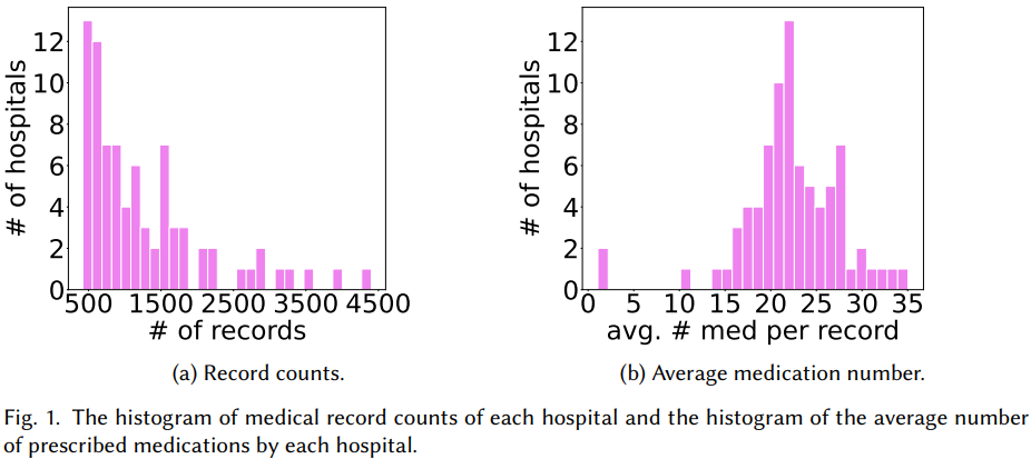 医生开药通常是治疗病人的一个重要手段,但是面对病人各种各样的疾病,这一过程对医生的专业水平要求非常高并且耗时费力。为了应对这一任务专业性和复杂性需求,当前已经有许多的相关研究寻求开发出自动化的药品推荐系统来辅助医生进行决策。然而,当前的研究集中于为有丰富医疗数据的医院单独开发一个药品推荐系统,而忽视了在真实情况下有许多的医院并没有积累足够多的医疗数据。如图1(a)所示,我们分析了一个多中心的医疗数据库eICU,发现大部分的医院仅有不足1500个样本数据,这对于充分训练一个药品推荐模型是具有很大挑战的。