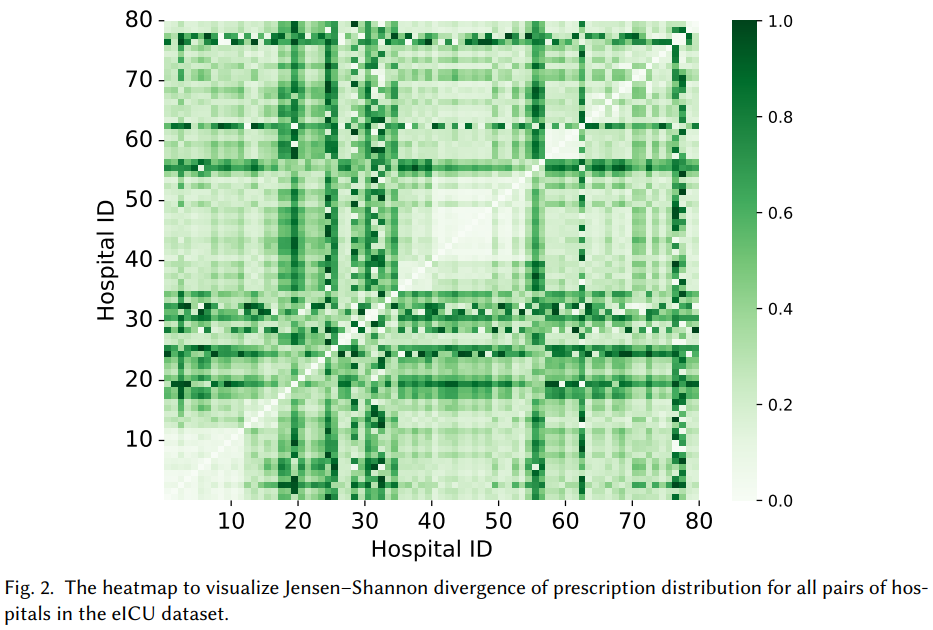 虽然,使用所有医院的数据训练一个统一的药品推荐模型是一个可能的方案。但是,不同医院因为医疗条件、专业性等差别,开药的分布通常是不同的。如图1(b)所示,不同医院的平均每次开药数量具有很大的差别。此外,为了更近一步验证这一分布差异,我们计算了每两个医院之间开药分布的Jesen-Shannon divergence(JSD)距离,并可视化了所有医院间JSD距离的热力图,如图2所示。从图中可以发现大部分医院对的JSD距离是大于0.4的,甚至很多都大于0.8。这说明了不同医院的开药情况具有很大的不同。