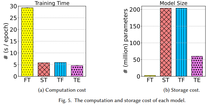 FT, ST, TF和TE分别表示Full-Train,Single-Train,全量参数微调和提示微调。我们发现全量训练的耗时最长,但是因为其用一个模型服务全部医院,所以存储消耗是最小的。ST和TF因为都要对全部参数进行微调,所以训练时间依然大于提示微调。而存储方面,因为提示微调只需要存储不同医院的提示向量和MLP参数,因此其消耗虽然大于FT,但显著少于ST和TF。