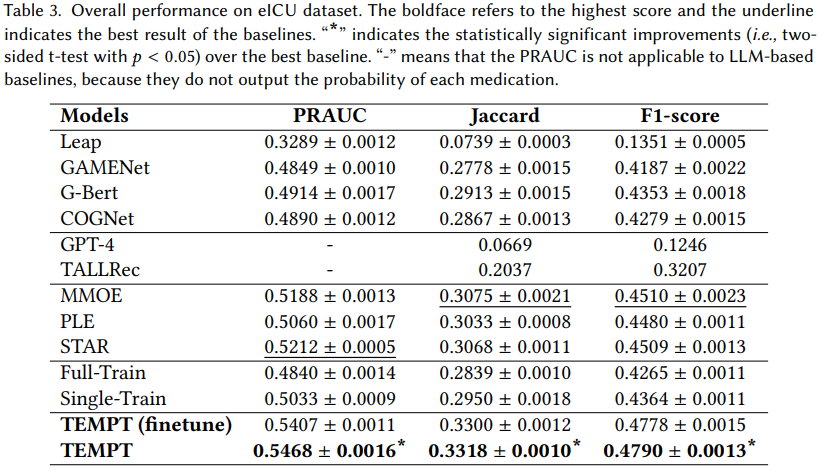 我们一共对比了四组方法:(1)传统药品推荐模型:Leap, GAMENet, G-Bert, COGNet;(2)基于大语言模型的药品推荐方法:GPT-4, TALLRec;(3)多域推荐模型:MMOE, PLE, STAR;(4)TEMPT的变体方法:Single-Train, Full-Train和Finetune。