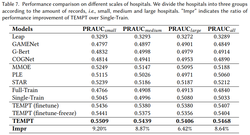 从总体效果来看,传统药品推荐模型的效果都远差于MDR和TEMPT。原因在于现在的模型都没有考虑到多中心的场景,大部分医院的数据量不足以支持充分训练药品推荐模型。基于大模型的方法同样表现较差,因为大模型更擅长零样本和少样本的设定,并且它们并不具有充分的医疗领域的知识。虽然MDR的方法表现较好,但是依旧差于TEMPT,因为MMOE和PLE难以适配医院数量特别多的情况,而STAR难以应用transformer这类能力更强的模型架构。TEMPT(finetune)的效果验证了预训练-微调的方式非常适合于多中心药品推荐的任务,但是其面临灾难性遗忘的问题,导致不如我们所提出的提示微调的方法。