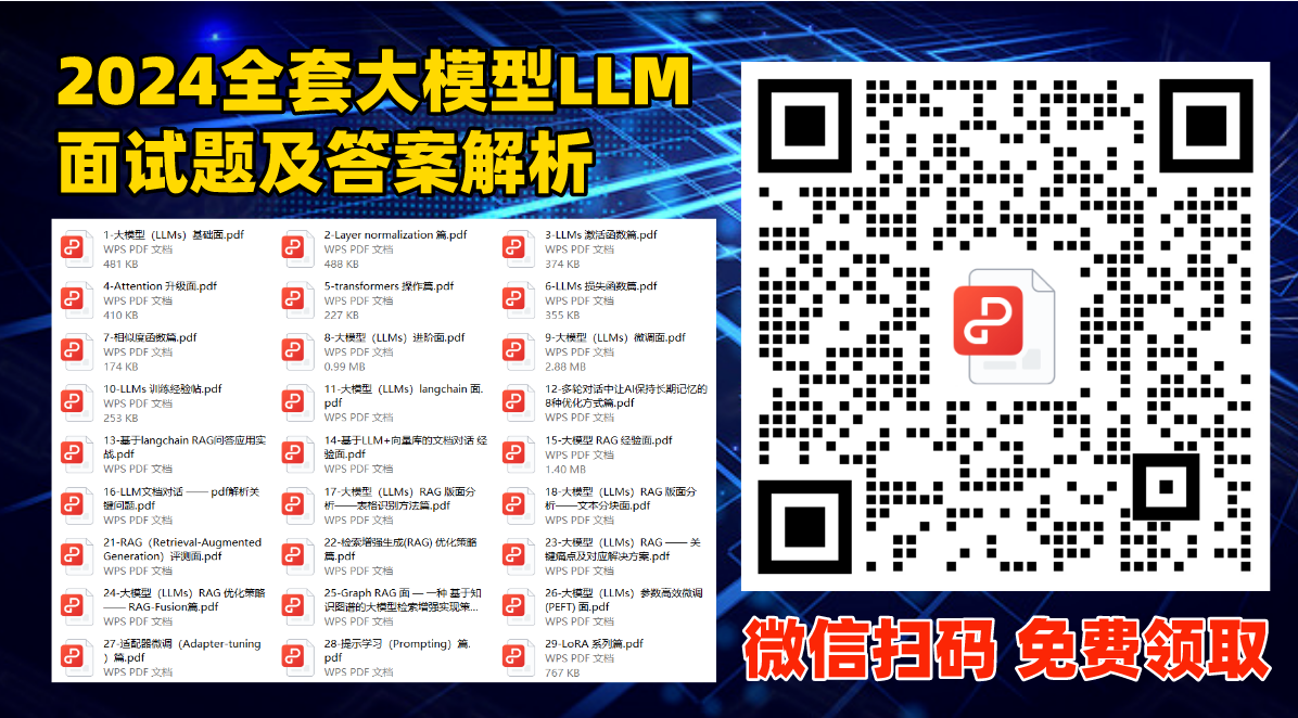 全套的AI大模型面试题及答案解析资料的小伙伴,可以微信扫描下方优快云官方认证二维码,免费领取【保证100%免费】