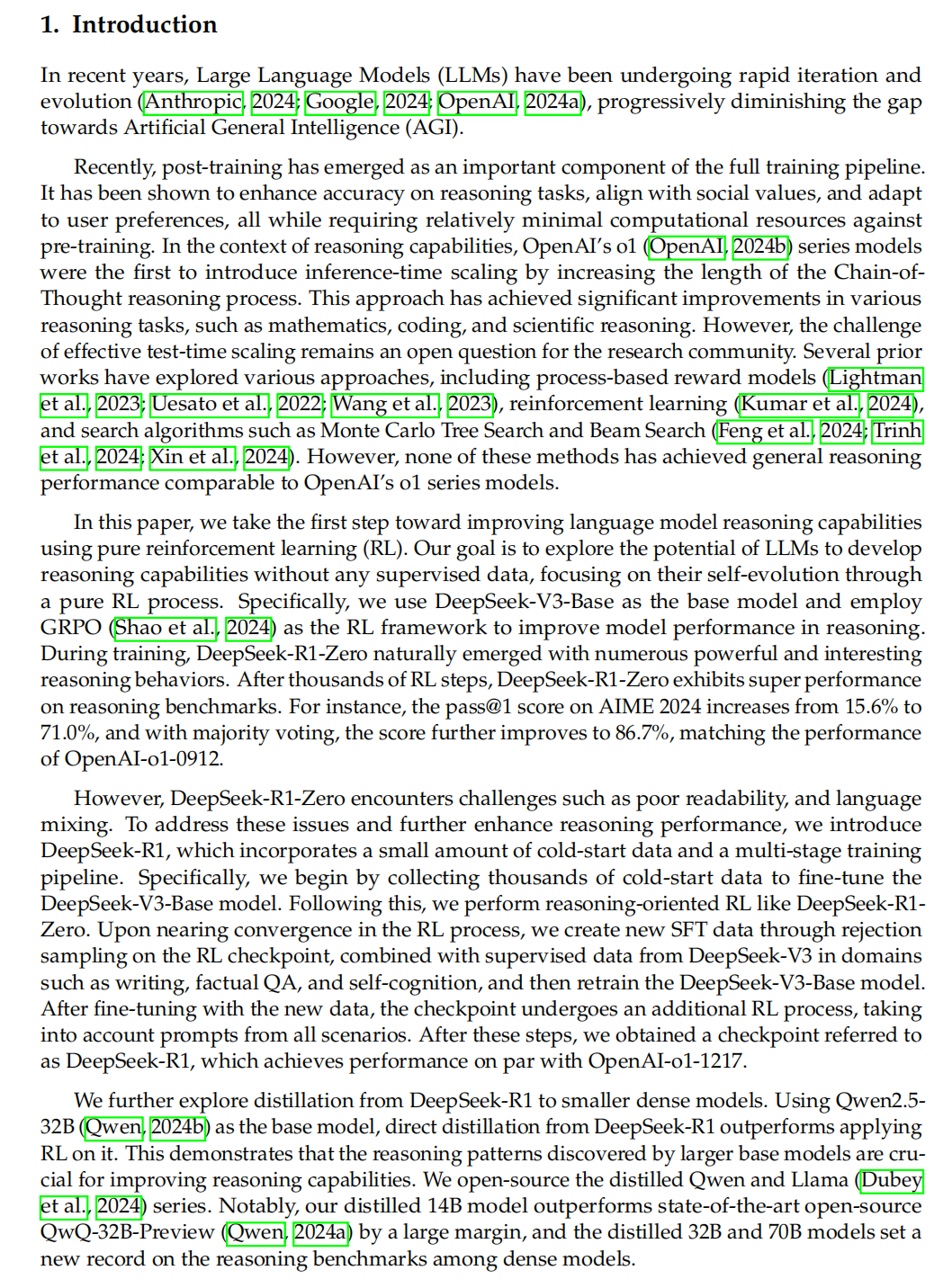 DeepSeek-R1在Introduction部分提到,R1通过结合 冷启动数据、多阶段训练管道和纯强化学习 ,显著提升了大型语言模型的推理能力,实现了与OpenAI的o1系列模型相当的性能,并通过蒸馏技术将推理能力传递给更小的模型。