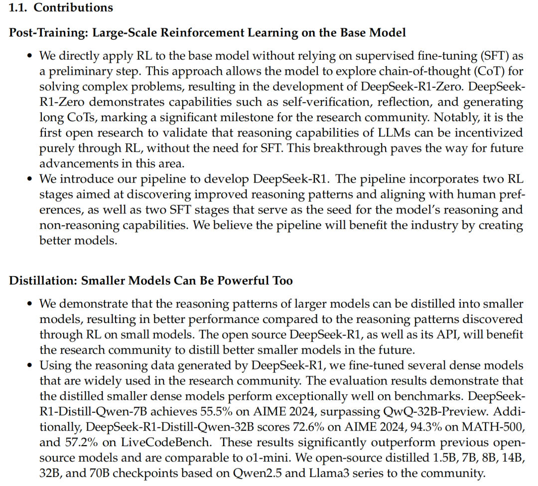 DeepSeek-R1在Contributions部分重点提到两个贡献: