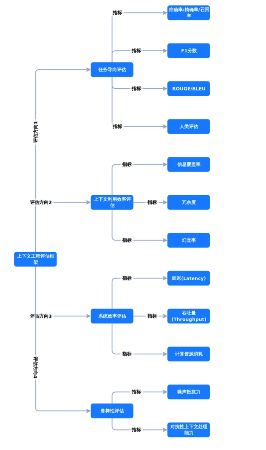 下图直观展示了上下文工程的评估框架,总结了评估不同方面的关键指标: