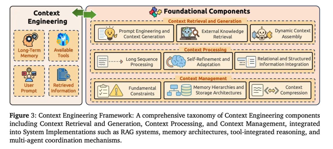 论文提出了一个二层分类体系,将上下文工程解构为基础组件(Foundational Components)和系统实现(Sophisticated System Implementations)两大类别。