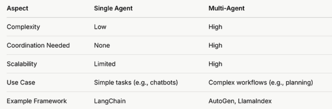 - 多智能体系统 (Multi-Agent): 多个 AI 协同工作,就像一个团队,其中一个处理物流,另一个处理客户服务。它更强大,但协调起来更困难。