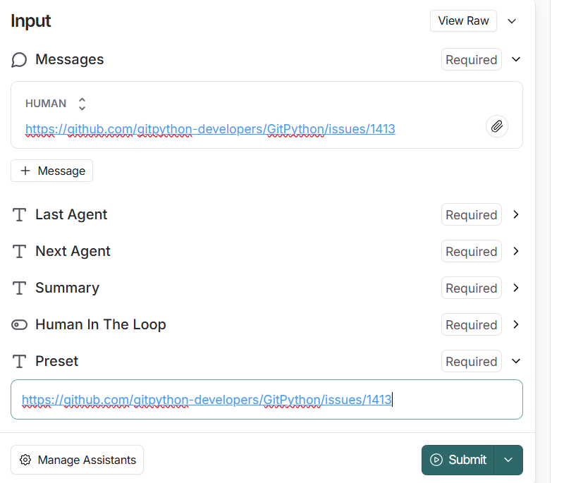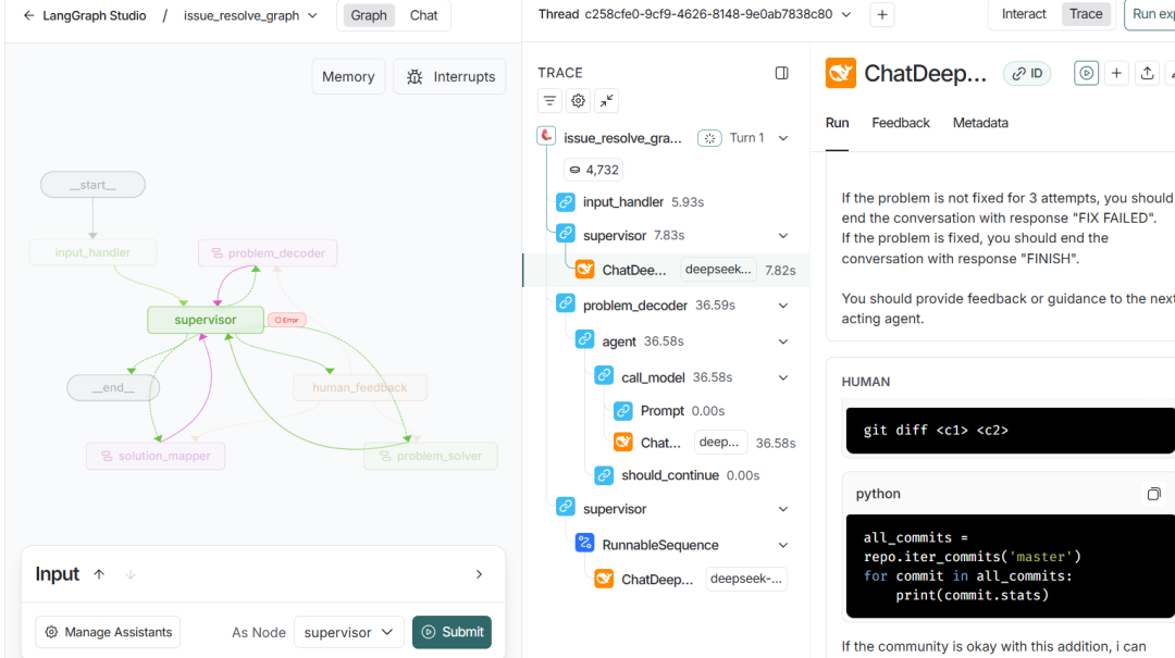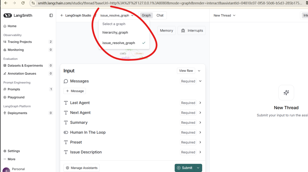 登录看到下面的界面, 下拉可以选择运行哪个graph,因为工程里面有两个图,一个基础的issue_resolve_graph 一个升级的