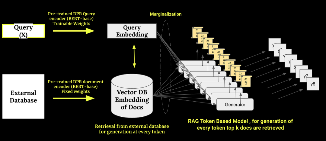 在RAG-Token系统中,生成过程被细分为一个个词语的生成步骤。在每一步,系统都会评估:基于当前的上下文,是否需要检索新的知识?如果需要,系统会根据当前的生成进度重新构建查询,获取最相关的文档,然后继续生成。