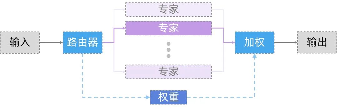 - 路由器(Router):又称门控网络(Gating Network),负责计算权重和调度专家子模型。