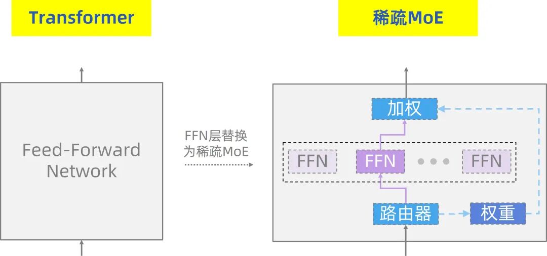 目前,大模型主要基于Transformer架构。将MoE引入到大模型中,主要方法是将原来Transformer中的前馈网络层(Feed-Forward Network,FFN)替换为稀疏MoE层。替换之后,